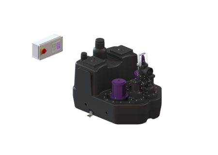 The lifting station for faecal and faecal-free wastewater is equipped with one or two submersible pumps and a backflow preventer. The collection tank made of permanently resistant polymer (PE) offers universal connection options and has a screwed access cover.