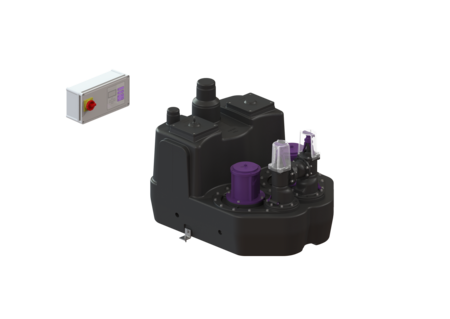 The lifting station for faecal and faecal-free wastewater is equipped with one or two submersible pumps and a backflow preventer. The collection tank made of permanently resistant polymer (PE) offers universal connection options and has a screwed access cover.