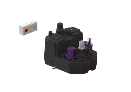 The lifting station for faecal and faecal-free wastewater is equipped with one or two submersible pumps and a backflow preventer. The collection tank made of permanently resistant polymer (PE) offers universal connection options and has a screwed access cover.