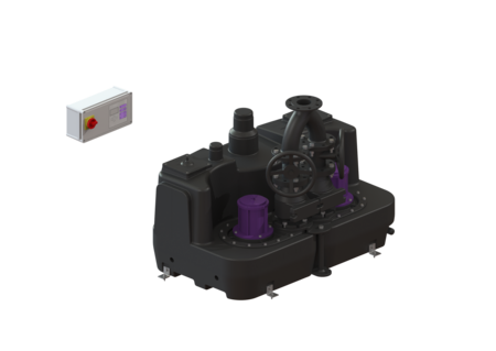 The lifting station for faecal and faecal-free wastewater is equipped with one or two submersible pumps and a backflow preventer. The collection tank made of permanently resistant polymer (PE) offers universal connection options and has a screwed access cover.