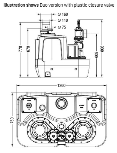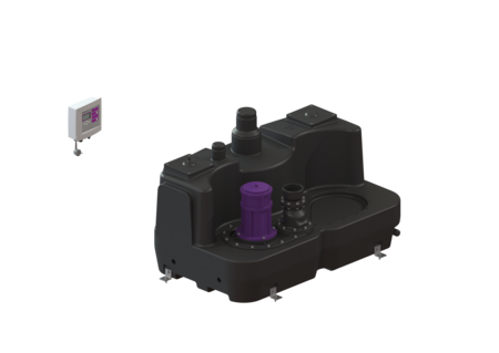 The lifting station for faecal and faecal-free wastewater is equipped with one or two submersible pumps and a backflow preventer. The collection tank made of permanently resistant polymer (PE) offers universal connection options and has a screwed access cover.