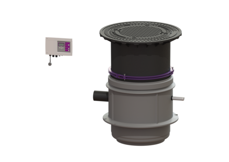 The pumping station without sewage wastewater is equipped with one or two submersible pumps and a backflow preventer. The collection tank is an LW 600 chamber system made of permanently resistant polymer (PE-LLD) with open pump tank and universal connection options. Quick-release closures enable the integrated components to be removed easily.