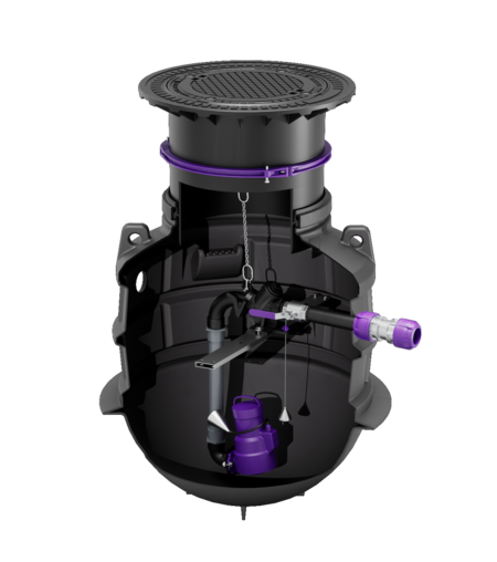The pumping station for wastewater with and without sewage is suitable for underground installation and is equipped with a backflow preventer for the pressure pipe. The PE tank is resistant to domestic wastewater and includes a pedestrian class polymer cover plate.