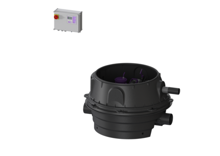 The backwater lifting station for faecal and non-faecal wastewater is equipped with two submersible pumps, one motor-driven and one mechanical closure system and a backflow preventer. The collection tank made of permanently resistant polymer (PE) has an enclosed pump tank.