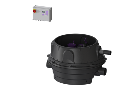 The backwater lifting station for faecal and non-faecal wastewater is equipped with two submersible pumps, one motor-driven and one mechanical closure system and a backflow preventer. The collection tank made of permanently resistant polymer (PE) has an enclosed pump tank.