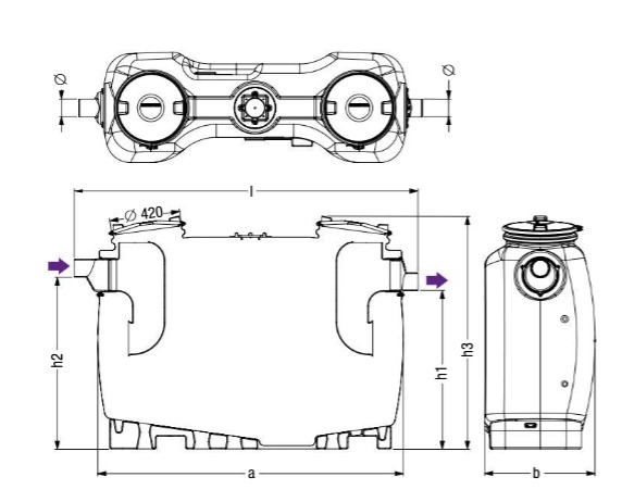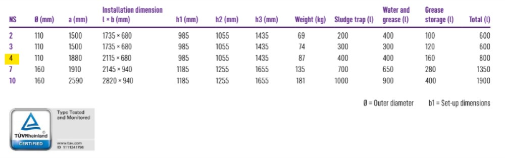 Atık su içeren yağ için ayırıcı sistemi, don korumalı alanlarda zemin üzeri kuruluma uygundur ve haznesinde hiç metal parça içermez. Dayanıklı polimerden (PE) yapılmış toplama haznesi, entegre bir tortu tutucu içerir. Hızlı kapama kilidi olan koku geçirmez iki kapak, temizlik ve bakım işleri için kolay erişim sağlar. Vakum sistemli vidanjör gereklidir. Hazne, manuel tahliye sırasında açılır.