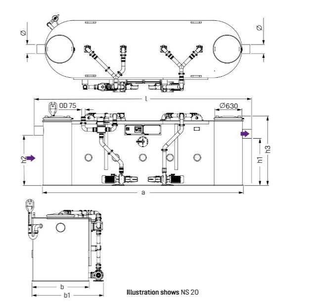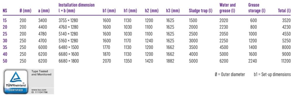 The separator for greasy wastewater is suitable for free-standing set-up in frost-protected rooms and comes without metallic components in the tank. The collecting tank made of permanently resistant polymer (PE) is equipped with an integrated sludge trap and has slopes in the tank base for fast and clean disposal. Two odour-tight covers with quick-release closures make easy access possible for cleaning and maintenance work. The innovative Shredder-Mix-System with integrated macerating system is responsible for homogenising and circulating the tank contents. Cleaning and odour-neutral disposal takes place via an exterior pump with 2-way valve and actuator which can be disconnected from the tank by a shut-off valve. The fully automatic program run is controlled by a user-friendly control unit with multi-line display that can be integrated into the building management system through a potential-free contact. Cleaning and disposal can be started remotely using the remote control, which is available as an option. Thanks to the customisable cleaning program with fast-selection function, cleaning can be adapted to the local circumstances as required. Observance of the Drinking Water Hygiene Directive can be guaranteed through the fully automatic rinsing of the drinking water pipes. 20 year polyethylene warranty.