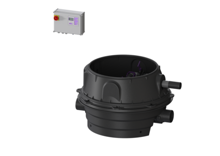 Quick-release closures enable the integrated components to be removed easily. Normally, draining takes place via the natural fall to the sewer. In case of backwater, the closure system is closed by the backflowing water. During the backwater phase, the water drains via a pressure pipe, which carries the wastewater into the sewer. The pressure pipe is a welded PE pipe; with pump SPF 4500, the pressure pipe must also be continued up to a pressure release chamber. The station is controlled by a user-friendly control unit, which is optionally integrated in the building management system via a potential-free contact, or alarm and collective fault messages can be output via a GSM interface. The KESSEL modular system provides different upper sections and engineering chamber options as accessories.