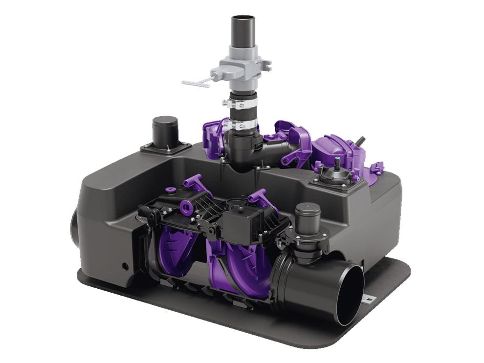 The Ecolift L for free-standing set-up is available in the nominal size DN 150 (Ø 160 mm) as a Mono or Duo system (equipped with one or two pumps). It disposes of the wastewater either with a pressure loop or an integrated bypass system. Other accessories make the handling even more convenient – from the practical wall bracket to the optical alarm sensor.