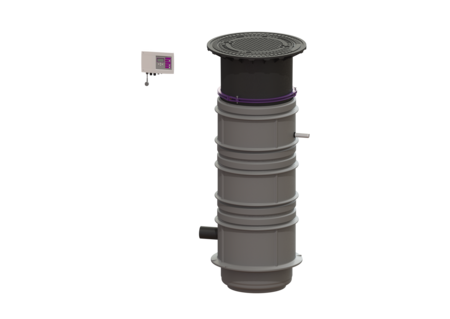 The pumping station without sewage wastewater is equipped with one or two submersible pumps and a backflow preventer. The collection tank is an LW 600 chamber system made of permanently resistant polymer (PE-LLD) with open pump tank and universal connection options. Quick-release closures enable the integrated components to be removed easily.