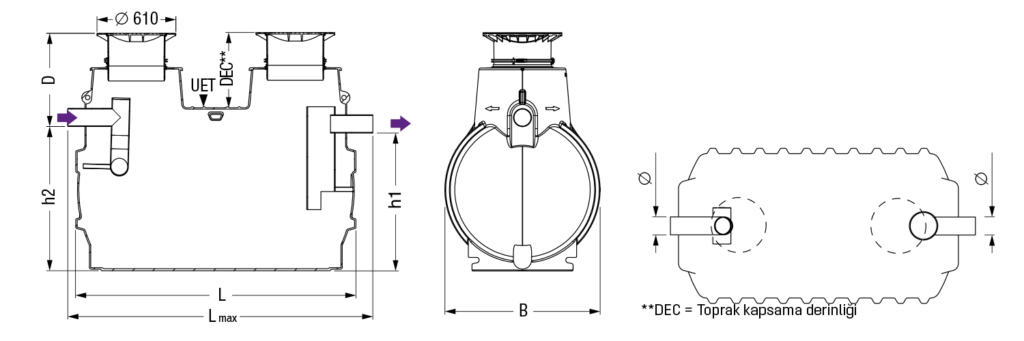 •  Haznenin üst kenarına (UET) kadar olan yer altı suyuna kurulum yapılabilir