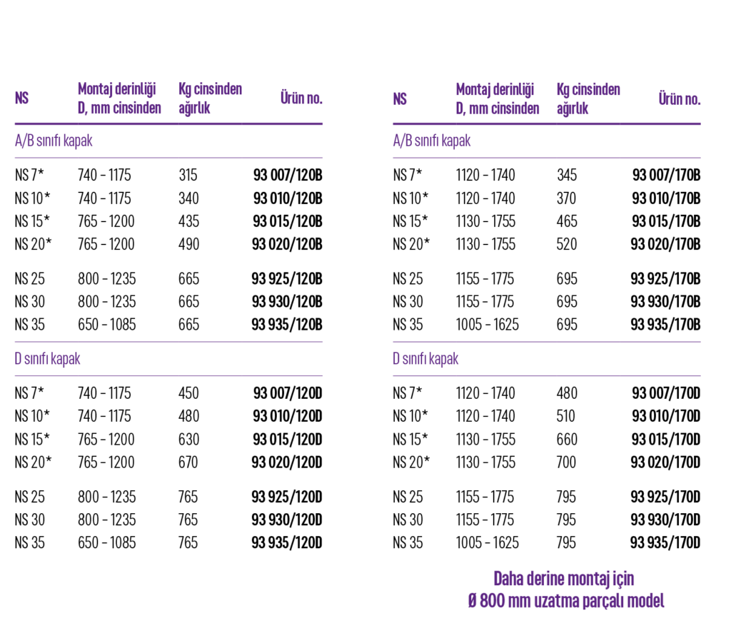 •  D Sınıfı = 700 mm ≤ DEC ≤ 1500 mm A/B Sınıfı = 700 mm ≤ DEC ≤ 1800 mm