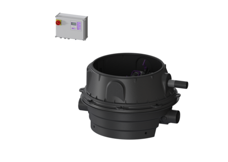 . Quick-release closures enable the integrated components to be removed easily. Normally, draining takes place via the natural fall to the sewer. Backwater is detected by an optical probe, which causes the motor-driven closure system to close automatically and there is no longer free passage to the sewer. During the backwater phase, the water drains via a pressure pipe, which carries the wastewater into the sewer. The pressure pipe is a welded PE pipe; with pump SPF 4500, the pressure pipe must also be continued up to a pressure release chamber. The station is controlled by a user-friendly control unit, which is optionally integrated in the building management system via a potential-free contact, or alarm and collective fault messages can be output via a GSM interface. The KESSEL modular system provides different upper sections and engineering chamber options as accessories.