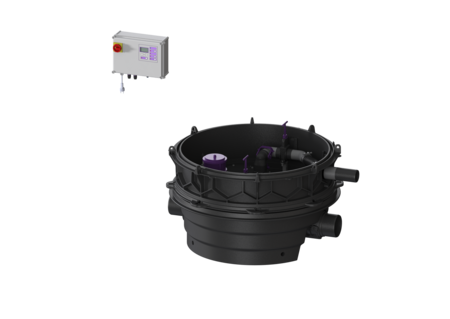 Quick-release closures enable the integrated components to be removed easily. Normally, draining takes place via the natural fall to the sewer. In case of backwater, the closure system is closed by the backflowing water. During the backwater phase, the water drains via a pressure pipe, which carries the wastewater into the sewer. The pressure pipe is a welded PE pipe; with pump SPF 4500, the pressure pipe must also be continued up to a pressure release chamber. The station is controlled by a user-friendly control unit, which is optionally integrated in the building management system via a potential-free contact, or alarm and collective fault messages can be output via a GSM interface. The KESSEL modular system provides different upper sections and engineering chamber options as accessories.